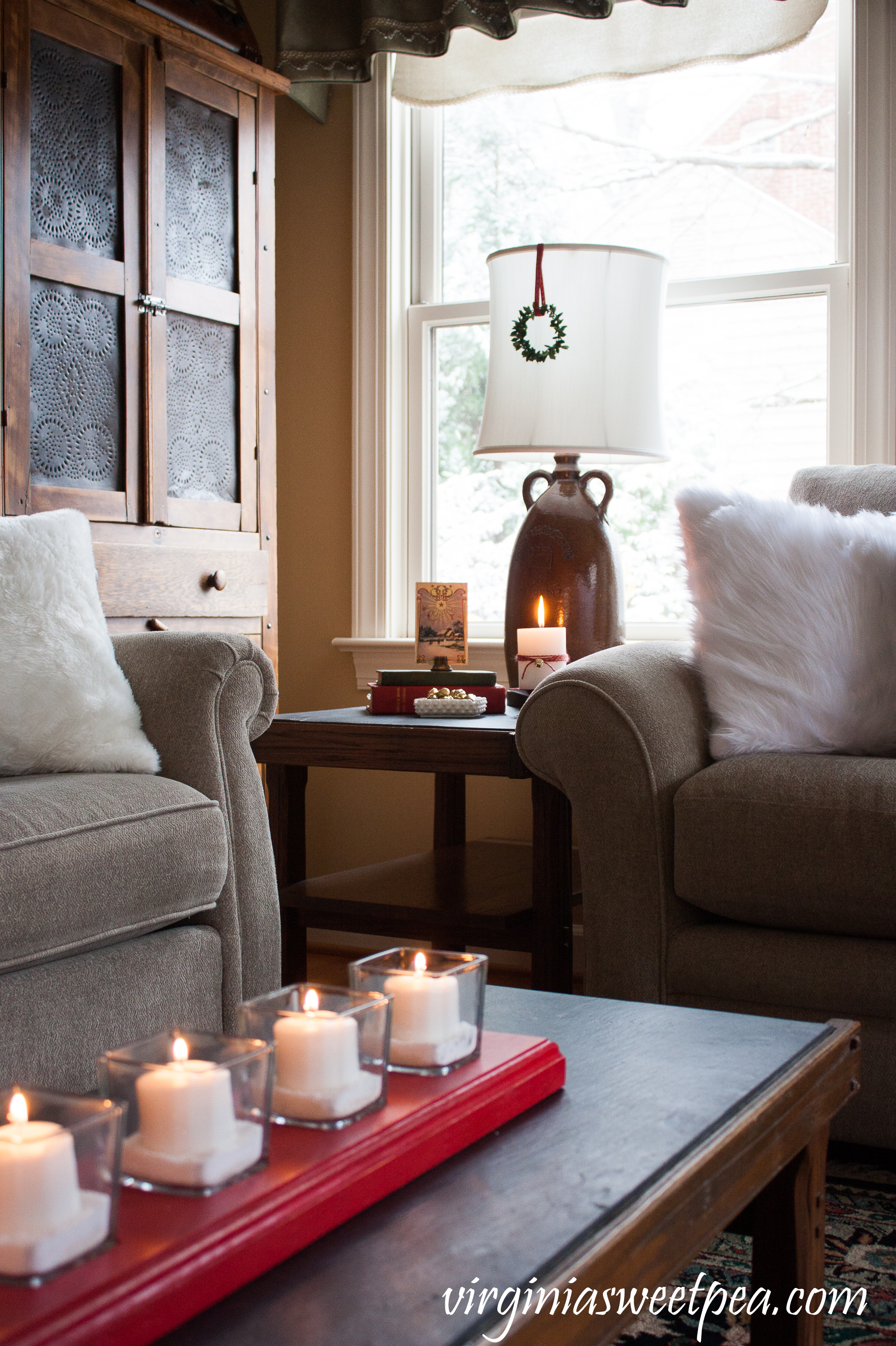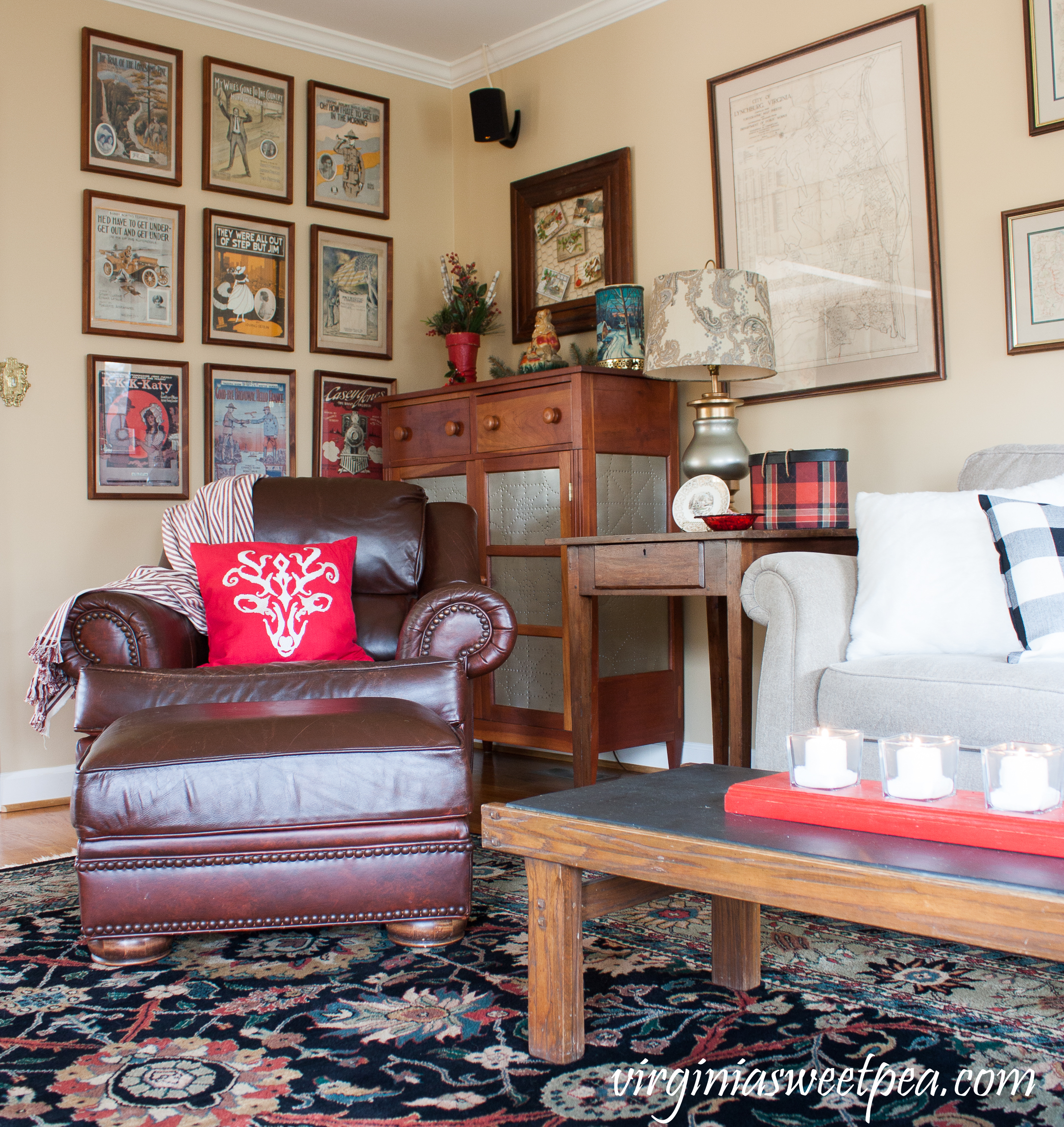 My husband helped me make the Christmas sign hanging over the sofa. All of the other decor in this room is vintage or items that I’ve enjoyed using for many years.