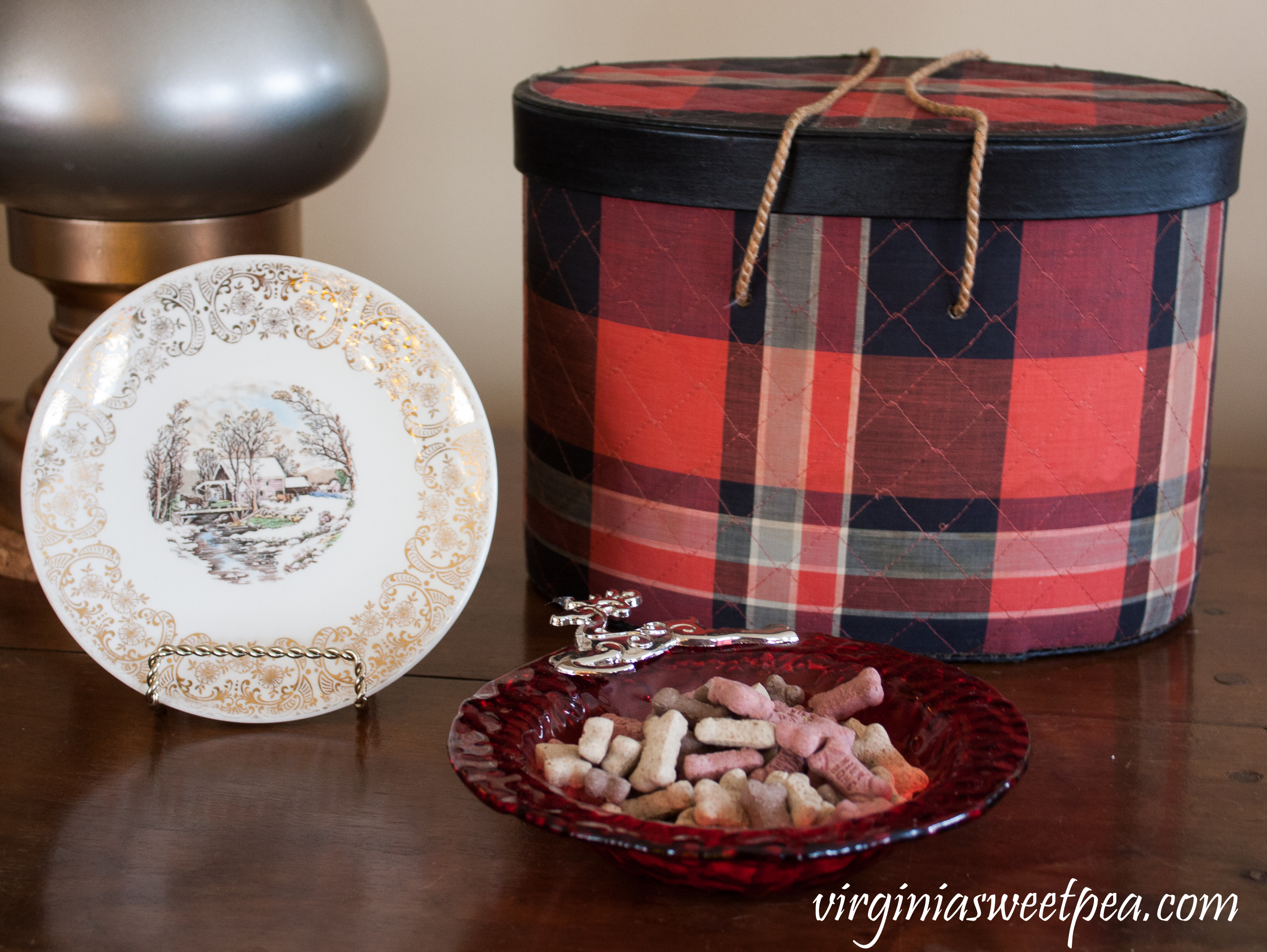 Our dog shamelessly begs for treats all evening, so we keep them handy in a reindeer bowl that was a gift from a friend. The plaid sewing box belonged to my great-great aunt.