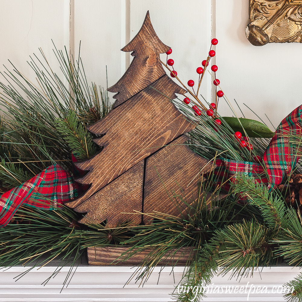 Last year I had so much fun making these  wooden trees  that I made two extra ones to give as gifts.  I really like how the trees look nestled in the garland along with the pops of color from the ribbon and berries.DIY Patchwork Wooden Christmas Tree